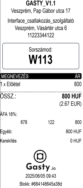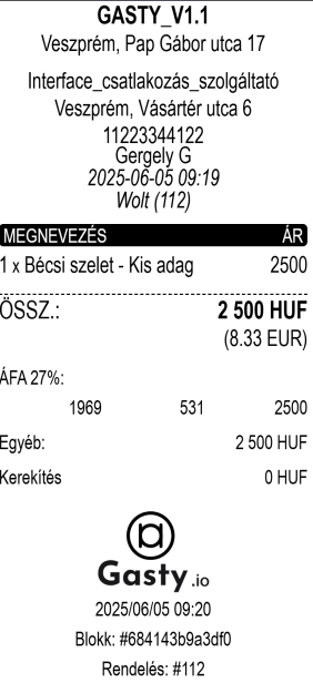 Amikor elkészült a rendelés, akkor a Gasty Kiszállítás nézetben először azt le kell fizettetni! Ekkor kerülnek beküldésre az NTAK adatok és kerül nyomtatásra az összesítő blokk egyéb fizetési típussal. Pénztárgép integráció esetén sem kerül nyomtatásra adóügyi blokk, tekintettel arra, hogy a számlát a Wolt állítja ki a vendég irányába!