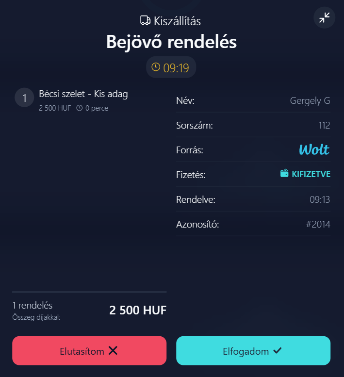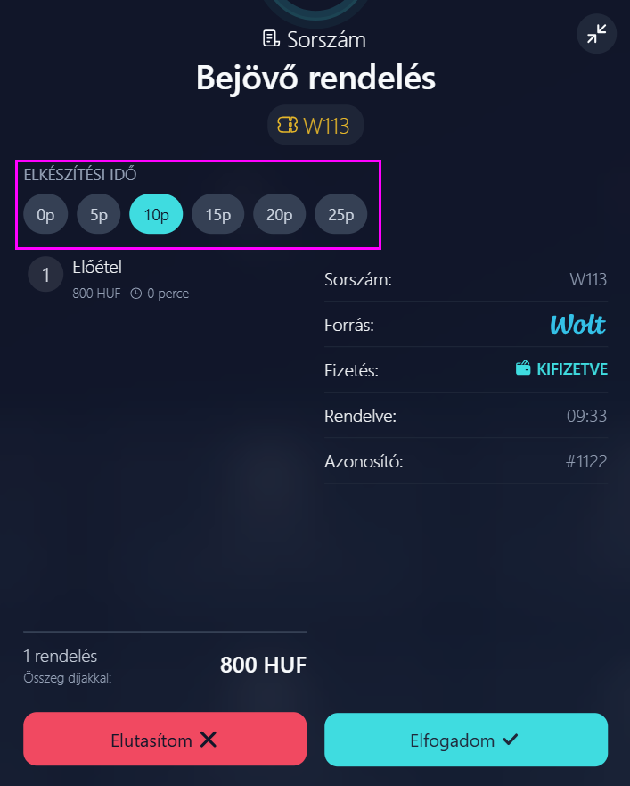 A Gasty felületen, amikor elfogadod a rendelést, akkor megadhatod, hogy mennyi idő alatt tudjátok elkészíteni az azonnali, nem ütemezett / későbbi időpontra kért rendelést (max. 25 perc). Ezt követően a rendelés bekerül a Sorszámok nézetbe "W" + a Wolt által küldött sorszámként (külön WOLT jelöléssel), valamint a Konyhanézetbe vagy konyhai blokk nyomtatással a konyhára. A háttérben értesítést küldünk a Wolt felé, így a Wolt tableten is átvált folyamatban lévőre az adott rendelés.